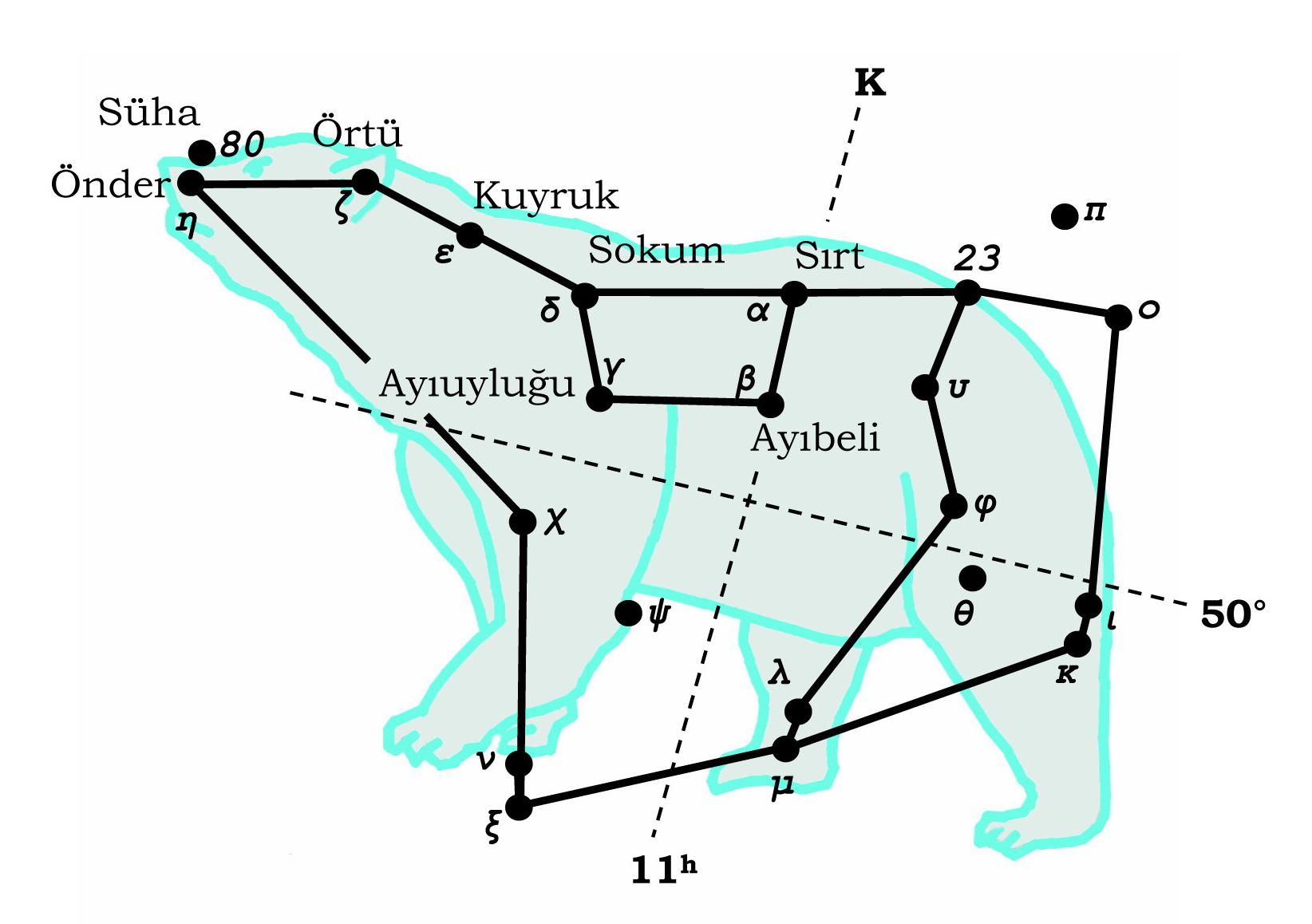 Kuzey gökkürede bir takımyıldız, koor. (11, 50). En parlak yedi yıldızının oluşturduğu ve Büyükkepçe diye bilinen yıldız kümesi dolayısıyla gökyüzünün en kolay tanınan takımyıldızlardan biridir. Hemen hemen her kültürde bu takımyıldız ile ilgili çok sayıda hikâye vardır. Grek esâtîrine göre Arkadya (= ayılar ülkesi)’nin kralı Likaon’un güzel kızı Kallisto, tanrı Zeus’un kıskanç karısı Hera tarafından ayıya dönüştürülmüştür. Daha sonra Zeus, onu oğlu Arkas ile birlikte kurtararak göğe yerleştirir. Öte yandan, Aristoteles, takımyıldızın ayı biçiminde oluşturulmuş olmasının nedenini ayının, donmuş kuzey kutbuna yerleşmeye cesaret eden tek başat hayvan olduğu biçiminde açıklamıştır → Büyükkepçe.