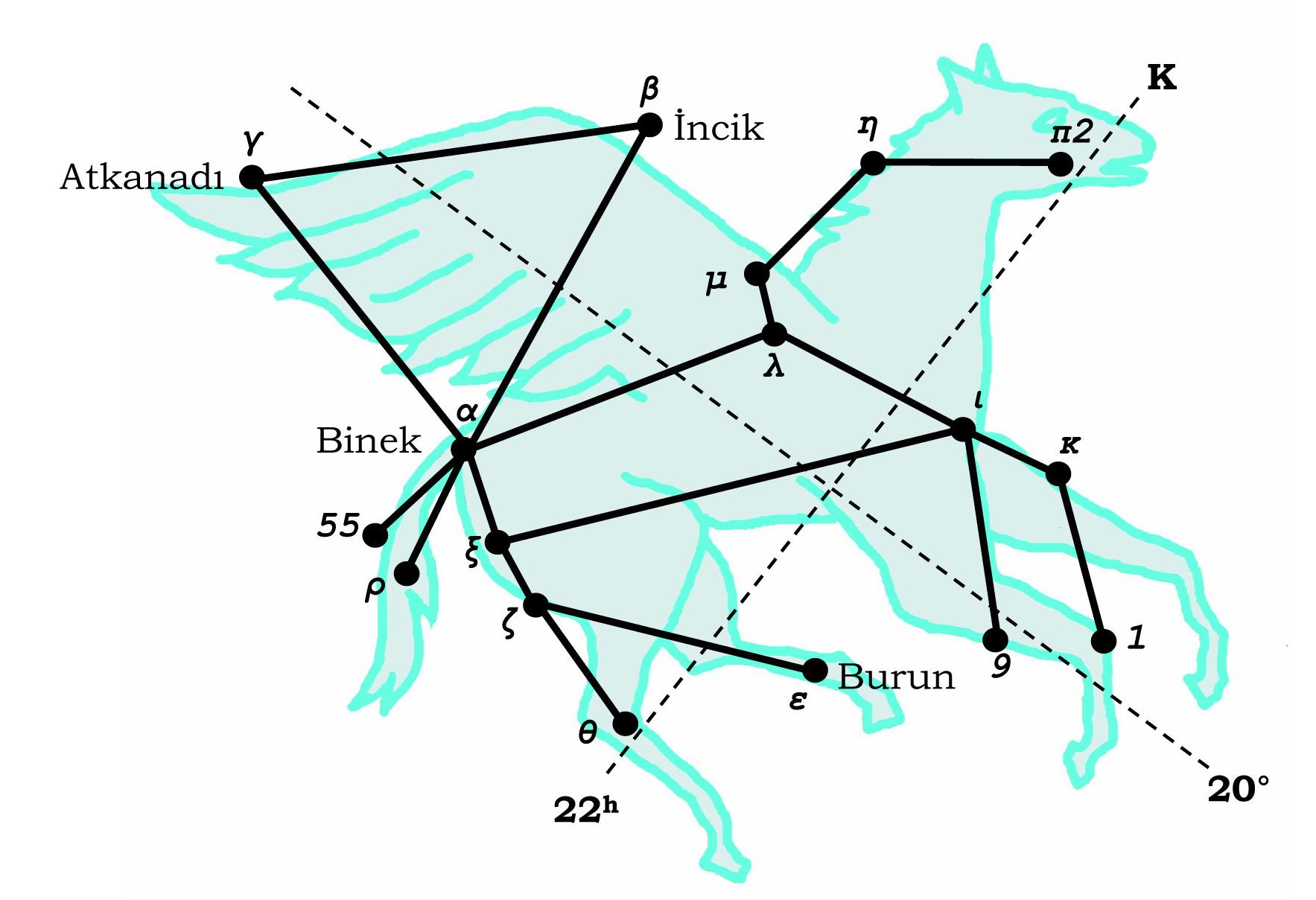 Kuzey gökkürede bir takımyıldız, koor. (22, 20). Grek esâtîrine göre kanatlı at Pegasus, yılan saçlı canavar kadın Medusa’nın kanı ile deniz köpüğünden doğmuştur. Denizden doğmakta olduğu için de gökte canlandırılan eski biçiminde yalnızca üst yarısı görülmüştü. Pegasus’la ilgili birçok hikâye anlatılagelmektedir → PERSEUS, ANDROMEDA, CETUS.