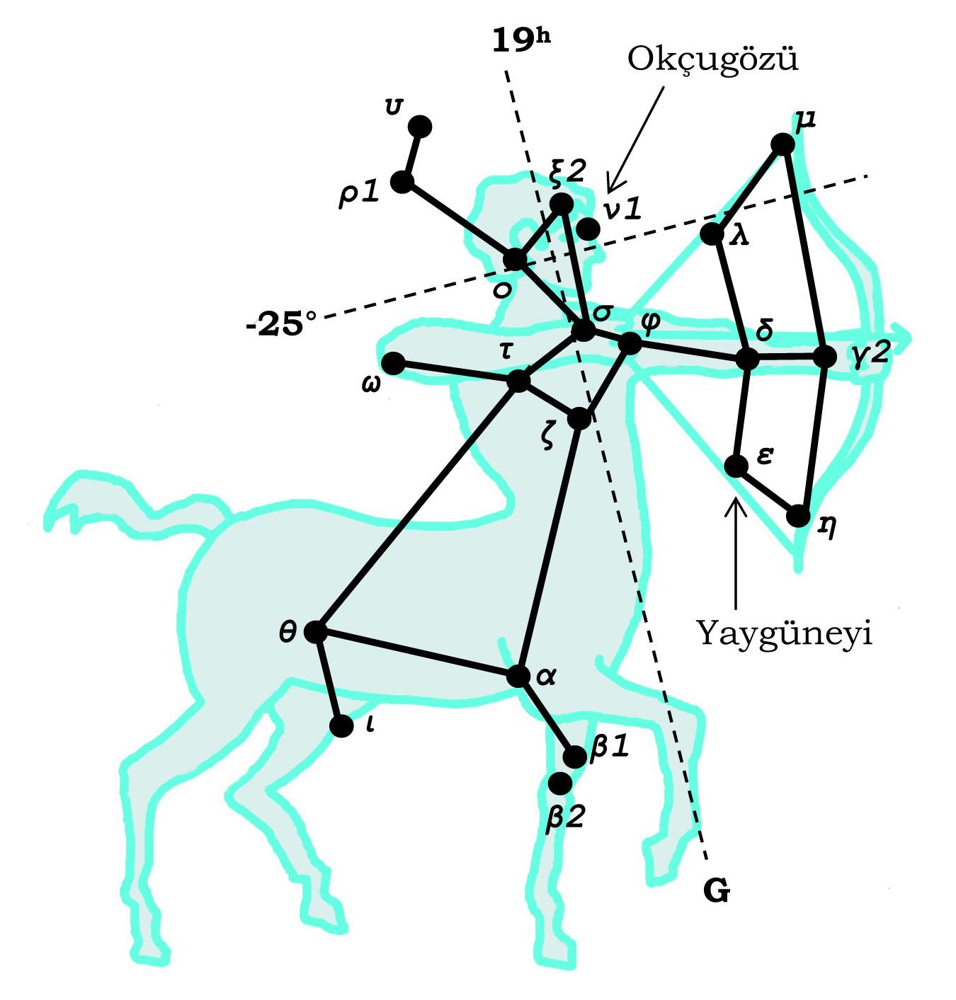 Gök eşleğinin güneyinde, burçlar kuşağı üzerinde bir takımyıldız, kıs. Sgr, koor. (19, -25). Bu takımyıldız, çeşitli dönemlerde çeşitli biçimlerde görülmüştür. El Sufi, takımyıldızı, belinden aşağısı at biçiminde ve sol elindeki yayı gererek ok atmaya hazırlanan bir okçu olarak tanımlamıştı. Grek esâtîrine göre, okçu attığı okla akrebi öldürmüş ve böylece avcı Oriyon’un öcünü almıştı. Yarı insan yarı at olmasından dolayı da sık sık ERBOĞA takımyıldızı ile karıştırılır.